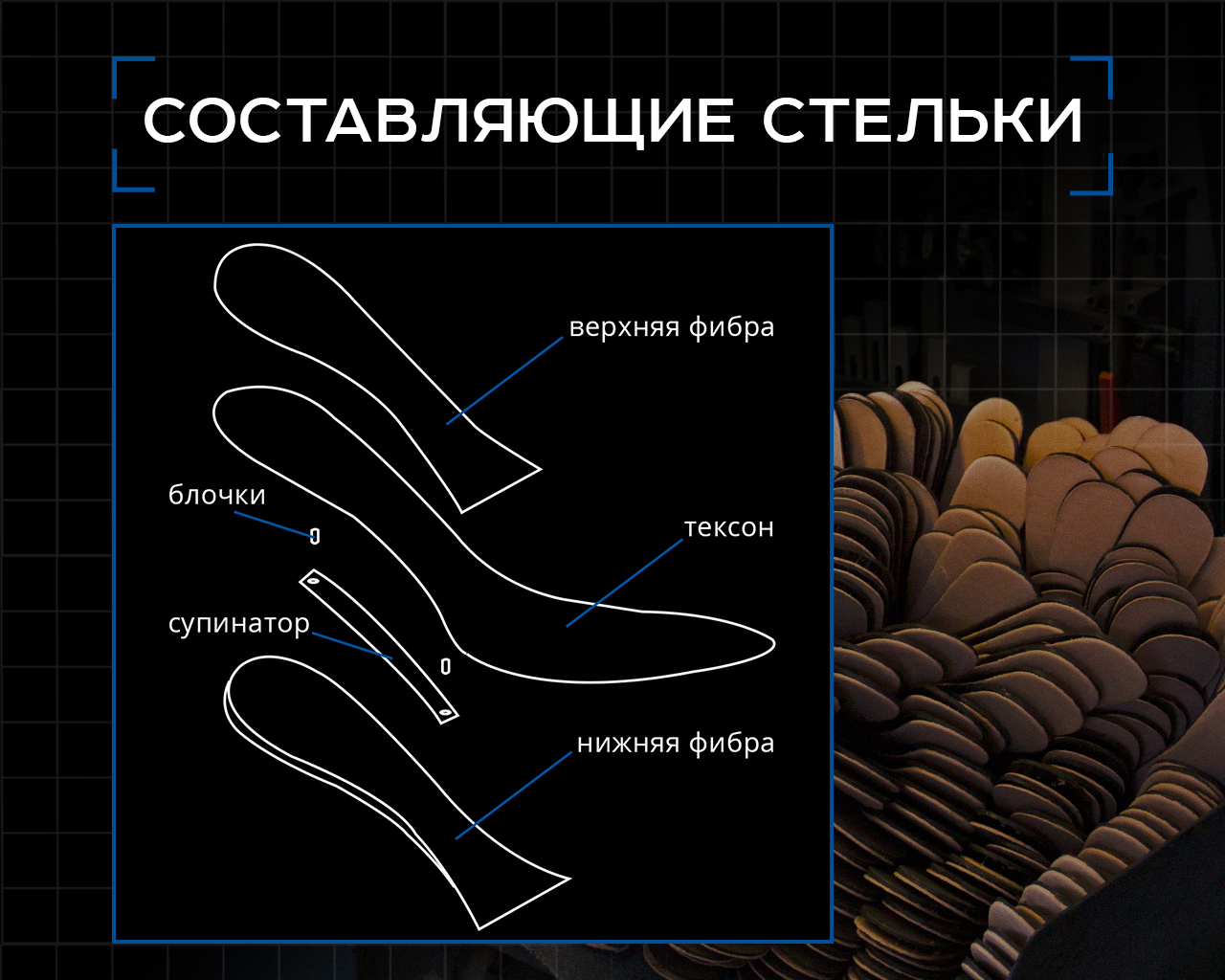 Стельки бывают одно-фибровые (до 4-го лома), двух-фибровые (с 4-го лома) и безфибровые (просто тексон), супинированные и несупинированные.